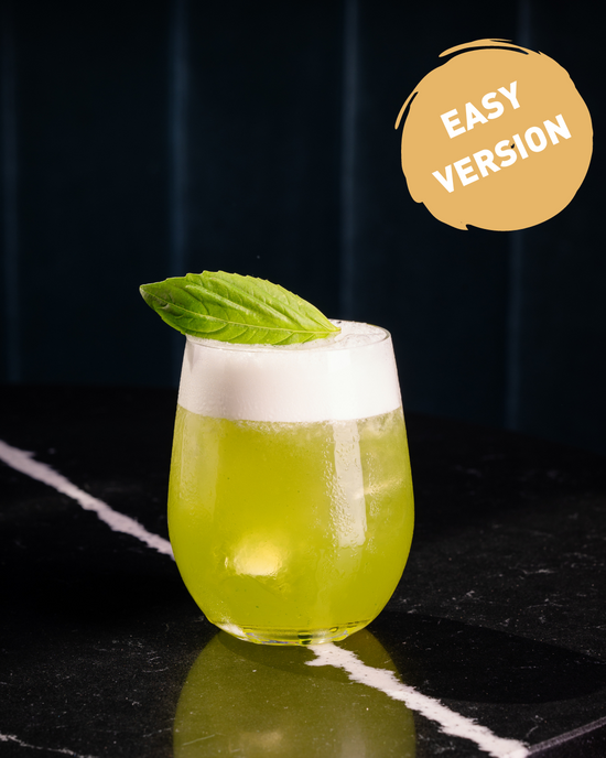 Handvoll BasilikumShaken, über Eis abseihen und Basilikumblatt als Deko