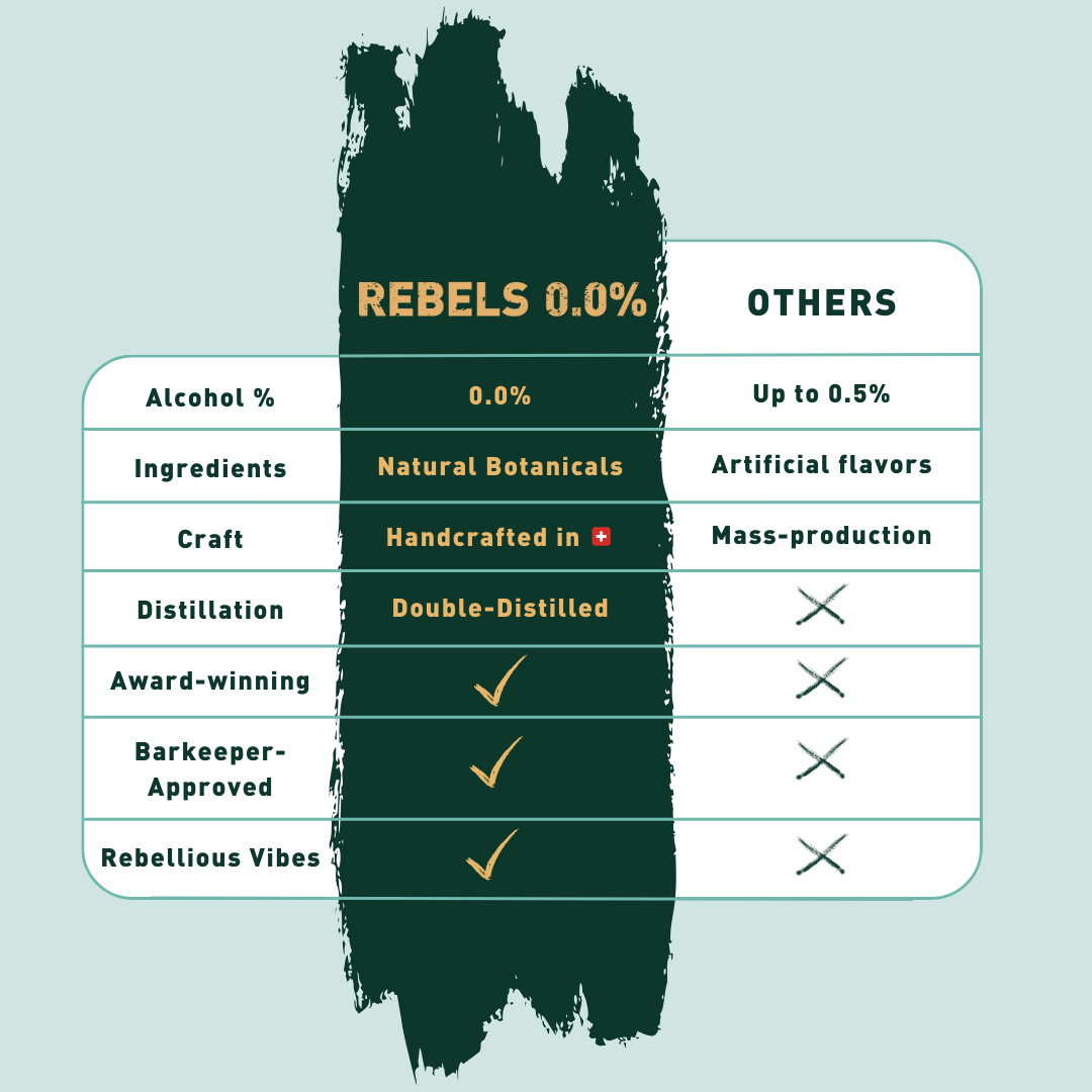REBELS 0.0% ist eines der meist ausgezeichneten 0.0%-Spirituosen-Portfolios und bekannt für herausragenden Geschmack – prämiert mit mehreren Goldmedaillen bei international renommierten Spirituosenwettbewerben.