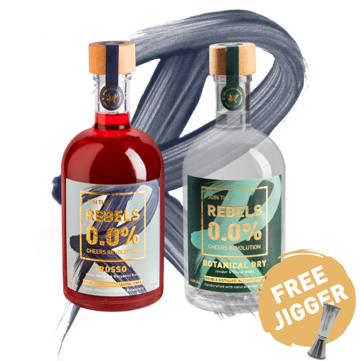 Wir präsentieren das Rebels 0.0% Negroni Set mit Jigger! Dieses Geschenkpaket enthält die Rebels 0.0% Rosso und Botanical Dry Flaschen sowie einen rebellischen Jigger GRATIS dazu.