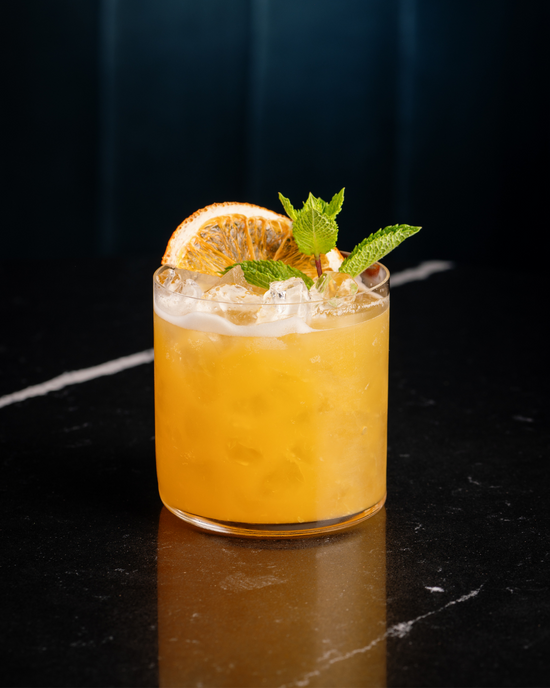 2cl Lime juiceShake, strain over crushed ice & garnish with mint and orange