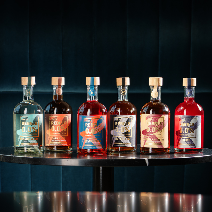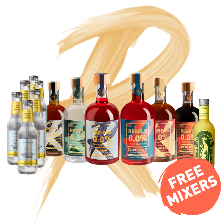 With this ultimate all-inclusive set you receive all 6 REBELS 0.0% bottles (Whiskey, Gin, Rosso, Spritz, Amaretto and Rosso) together with a choice of FREE mixers so you are all ready to mix like there IS a tomorrow!